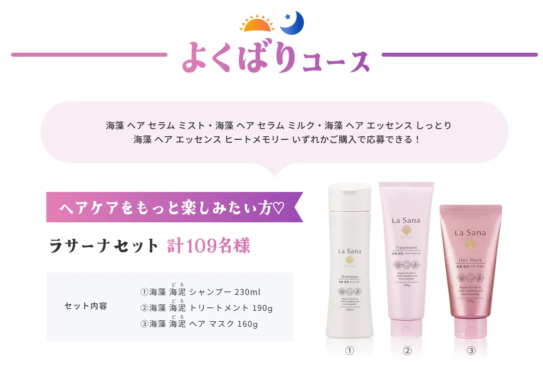 上記いずれかをご購入の方を対象に、応募者の中から抽選で【総計369名様】に「ラサーナ セット」や「吉田仁人さん(M!LK)のオリジナルグッズ」が当たるプレゼントキャンペーンです。